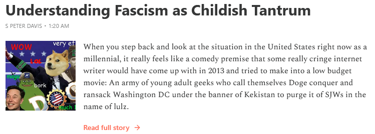 When you realize this and get to know it, then you can’t unsee it. You’ll notice it every time some grifter with nebulous politics who believes in nothing decides to brand themselves as right wing. The awkward born-again revelation to the divine truth of Jesus quickly follows suit. It very rarely comes off as convincing, but it doesn’t feel like being convincing is as important as the ritual.