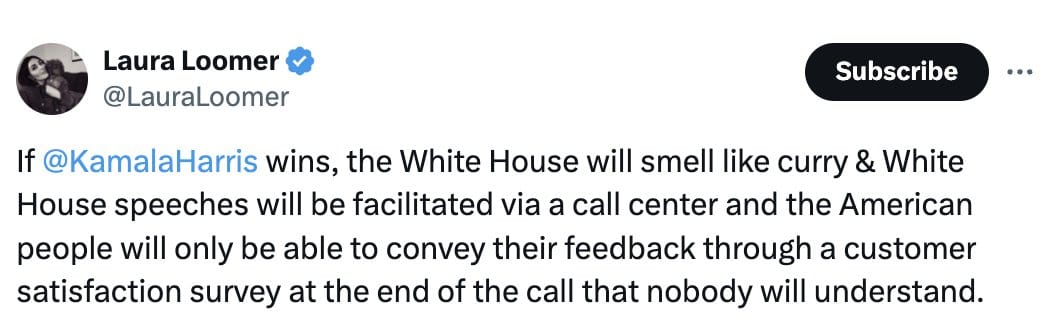 Incoming Vice President JD Vance, who is married to an Indian woman, was once asked to comment on Loomer’s racist crap, and chose instead to double down on it by adding “fried chicken” to the things that the White House would smell like if Harris were elected. Because he’s a piece of shit.