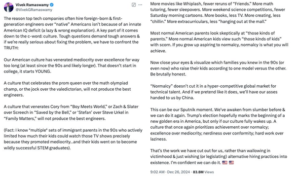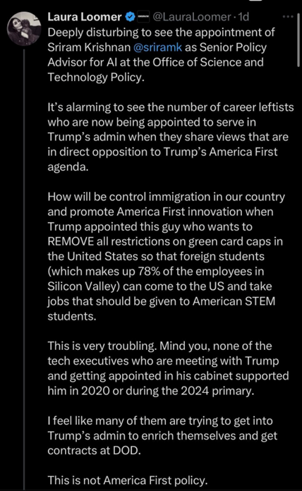 Loomer, the same as all of us frankly, had been watching Donald Trump add to his mouth-to-ass human centipede of cabinet appointees with growing horror, but it was a different type of horror to the one we’ve been feeling. Abundantly relieved, I imagine, for the dearth of black people or Hispanics, but deeply concerned for the number of appointees with names like Patel, Ramaswamy, and Bhattacharya. She finally became incensed enough to speak up when Trump announced Sriram Krishnan as his head of AI policy.