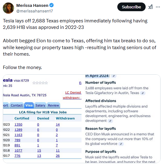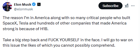Again, this is a shitty racist argument and everyone involved is a bastard. It’s like an argument between Jefferson Davis and Hitler—the former wants to expand the institution of slavery and the latter wants to abolish it because he doesn’t ever want to see a black person. You don’t need to take a side. But the Bannon Alt-Right aren’t incorrect about this being what Musk would do if he had his way with H1-B visas—he already has a very entrenched history of replacing as many American workers with foreign ones as he can get away with, and he’s not expanding his business to do this. He lays Americans off.