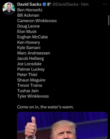 I thought that was a witty line but I also mean it literally—former PayPal fascist executive dipshit David Sacks, who will himself be joining Trump’s government in some made up Bitcoin department, is about as subtle about this as anything he ever says: