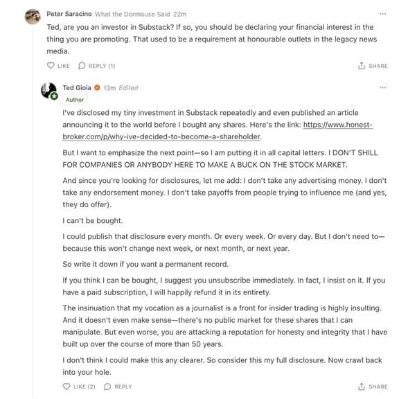 But the open reaction of the site owners, as well as a bunch of people who treat “Substacker” as a core component of their personality (not just blogger, but Substacker specifically) has been somewhere between amused curiosity and outward celebration. Among the latter is, for some reason, the award winning jazz historian and pianist Ted Gioia.