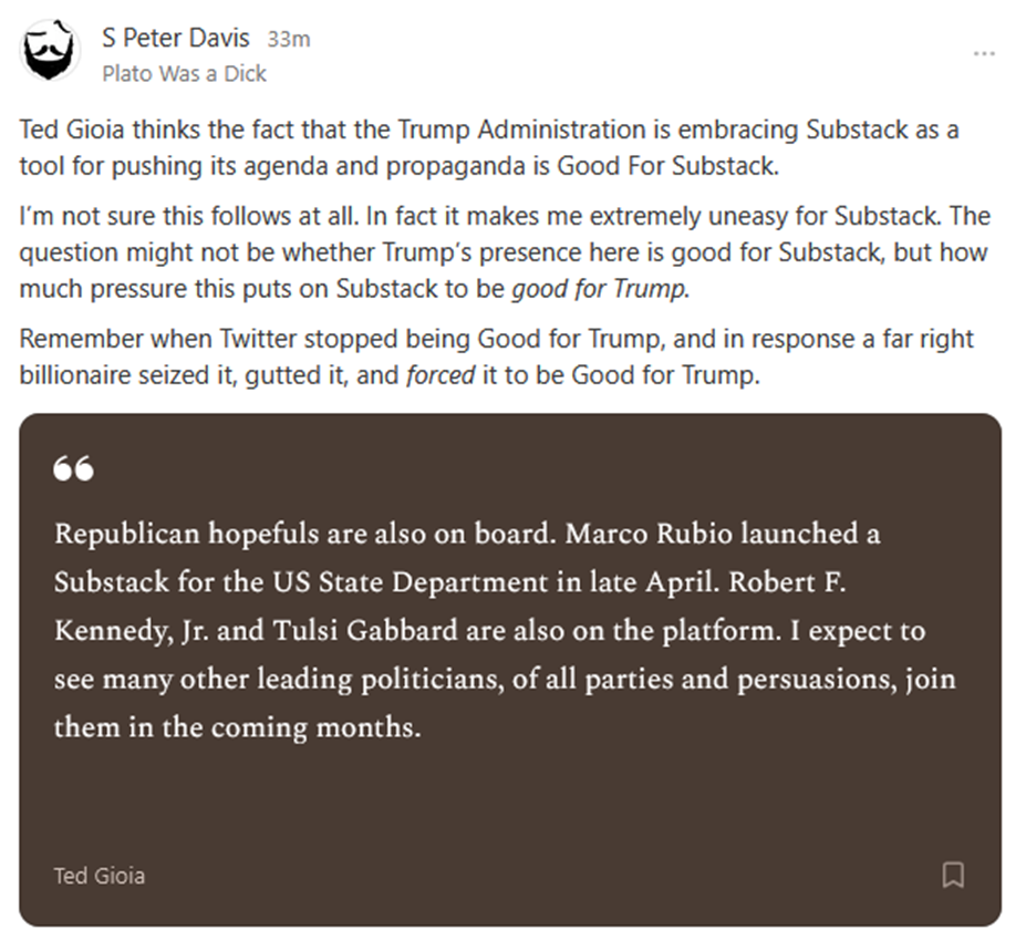To be completely fair to the management of Substack, there wouldn’t really be anything they could do, as far as I’m aware, to prevent the US Government from embedding itself on the platform even if they wanted to. My appeal is to those who, like Mr Gioia, see this as just another manifestation of viewpoint diversity as opposed to something that actually poses a dire risk to viewpoint diversity.