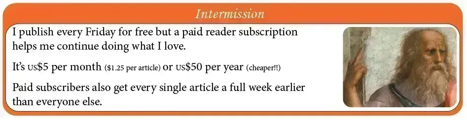 Bizarrely, though, once in a while, between his worldly wisdom and musings about the state of culture, he’ll drop a piece that’s just a blunt, soulless advertisement for Substack. Just a random, wholly out-of-character upbeat promotional piece as though he’s secretly writing copy for the company’s PR newsletter but posting mistakenly under his own name.