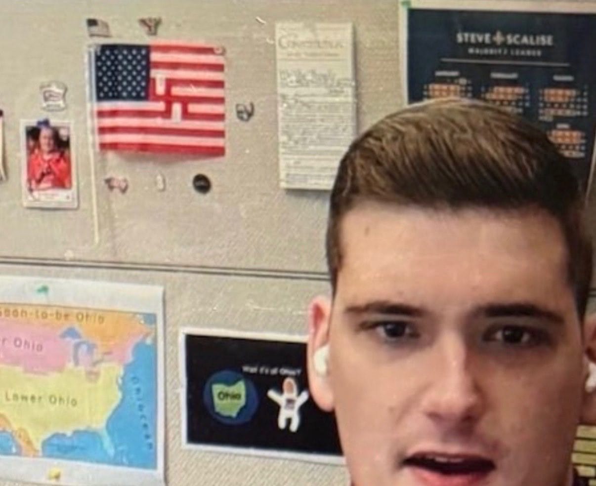What the media isn't mentioning (understandably, due to the swastika distraction) are the "Ohio" memes also prominently displayed behind this guy, providing clues about how internet baked this shithead is. But we'll get to that soon.