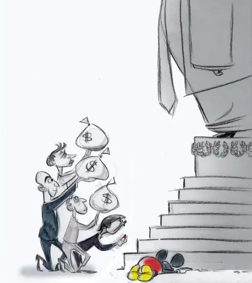 While we’re navigating this sort of thing we need to keep in mind the art of caricature, which seems to have some immunity shields that regular discourse doesn’t have. Political cartoons are free to depict Trump as an enormous malformed orange blob of hair, mouth, and gut, so obese that he’s nearly spherical, and such images attract less criticism than unaltered photographs of his ass accompanied by a snide comment. Take this Pulitzer Prize winning cartoon by Ann Telnaes: