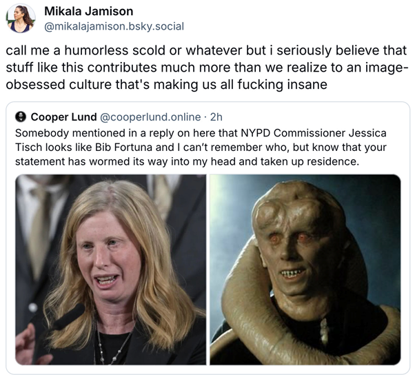 But see, this is where we get kind of a problematic situation where we’re walking on eggshells about criticizing assholes while leaving the gloves off for everyone else. Take the juxtaposition in this Saturday Night Live skit which appears to really pull its punches with Robert Kennedy Jr’s voice while going full throttle on Aimee Lou Wood’s teeth.