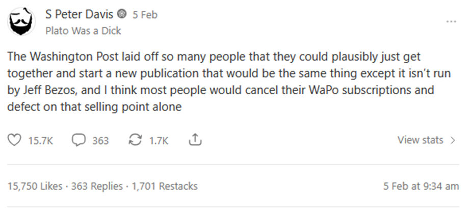 This isn’t a newsletter or an article, it’s a post, which I posted to Substack’s Notes social media platform. To be clear, this wasn’t even a serious post, it was kind of a joke. There’s much more to starting a media company than a bunch of people coming together to form Journalism Voltron. But I’ve never seen an actual newsletter do these numbers on the actual newsletter platform. I tapped into something here, I moved the needle in a way that is rare for me, I motivated people and excited them and inspired them. I influenced them. Even if the post is kind of nonsense, it broke through the noise.