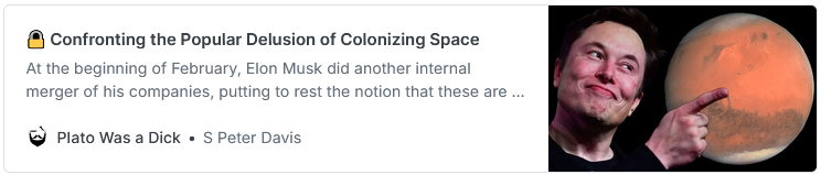 I'm also writing a book, which I'm hoping to publish and sell via audience interest from this very newsletter. I'll never be much of an influencer, but I hope I can get part of the way there. The working title is How Geeks Ate the World and if you like this newsletter then you'll probably like my book. If you're unsure, the good news is I’m going to be dropping parts of the draft into this very newsletter as the project comes along—but only for paid subscribers. A new chapter is coming out this very weekend! So if you want to read along in real time, please consider subscribing. Otherwise I’ll be keeping you in the loop. Check it out here: