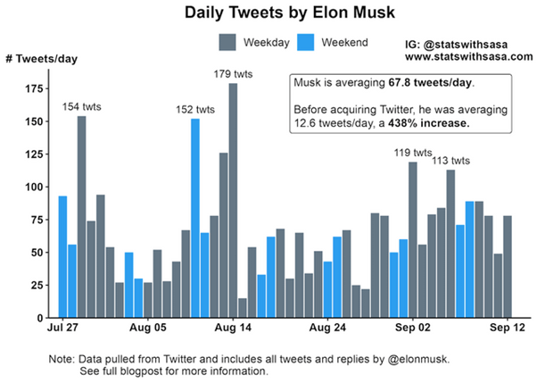 Ostensibly, Elon Musk runs six major companies. We can even be generous and drop that to three because I’m not sure if the others do anything or if they’re money laundering fronts. Busy guy, right? Now, keep that in mind and reconcile it with the fact that he tweets between 60 and 200 times a day.