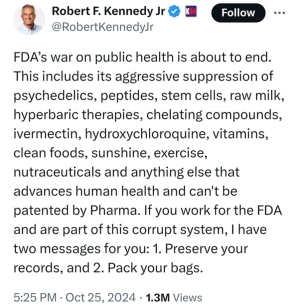 Kennedy’s first stated missions as health czar are to remove fluoride from drinking water and stop chemtrails. Basically, he’ll put a stop to unnatural therapies like measles vaccines and replace them with natural alternatives, like measles.