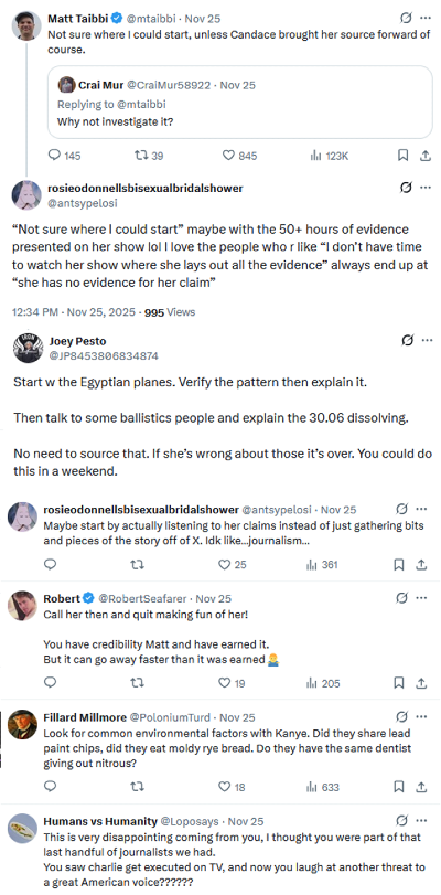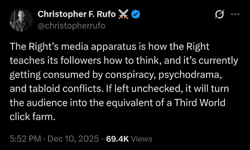 This is one of those scenarios where you shouldn’t be tempted to side with any of the sides on the table. But to be aware of the situation, the Rufo/Walsh/Pool/Johnson syndicate of MAGAland appear to be losing their fight to a different, slightly more 1930s flavor of bigotry. The infection of conspiracy culture within the mainstream right is so pervasive that even more centrist figures like Matt Taibbi are having to fight off attacks from their own fanbase about how they’re not taking Candace Owens’ international John Wick style assassination syndicate story seriously enough and demanding he investigate it.