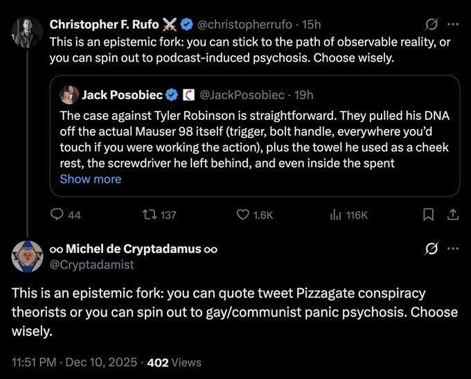 This is very predictable. The number one rule of conspiracy culture is that every major event is a false flag. The official narrative is always wrong, and nobody who is behind any major event is actually the person behind that event. This is a desirable belief to propagate when the accused isn’t politically useful, as the vast majority of times they are deranged nobodies. For example, the theory goes that Trump’s would-be assassin was a patsy and the hit was ordered by Biden himself. You can see how people like Rufo have no problem with that one whatsoever.
