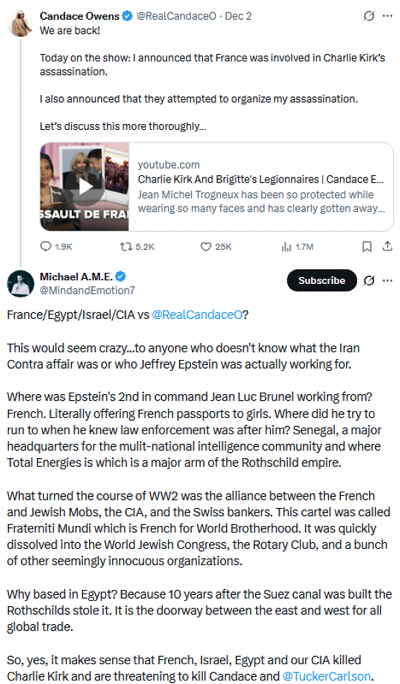 In actuality, Owens’ theory is an expansion of an increasingly deranged fiction that began with her accusing the wife of the president of France of being transgender. This led to her being sued by…. fucking… France, I guess, which has led to Owens slipping further into a paranoid fantasy in which Macron ordered her assassination, and she has subsequently spun this off into a theory that the French also collaborated with the Israeli government to take out Charlie Kirk, and this developing story also implicates Kirk’s widow Erika, Jeffrey Epstein, and the nation of Egypt for some reason.
