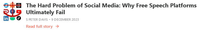 If this is starting to sound like an advertisement for Bluesky then that’s probably because I’m becoming really bullish on Bluesky. There are some very valid counterarguments to my optimism, including from the brilliant Cory Doctorow, whose dubiety should give anyone pause. To give counterbalance to myself I would recommend you read his article as well as Dave Troy’s article.