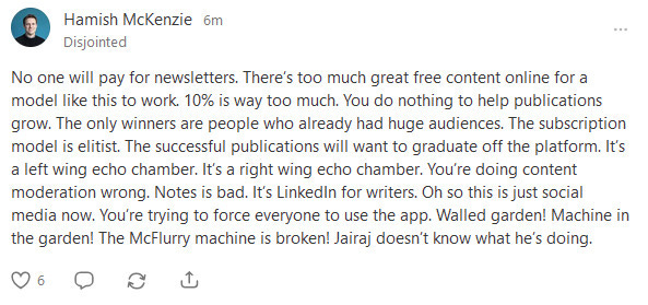 Like Twitter, Substack’s very strong focus is on algorithmic discovery. I don’t believe this is as malicious in Substack’s case as it is in Twitter’s—whereas Elon Musk wants you to “discover” shitbag racist opinions from the worst people in the world, Substack simply wants you to discover people to subscribe to, preferably with money. Intentions notwithstanding, the result is the same—a social feed, addictive in the first place, with extremely limited user control over an algorithm that is largely unconcerned by the amount of shitbag bigotry and fringe right liquid content it contains.