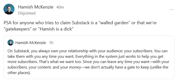 Nothing gets Substack co-founder Hamish McKenzie fired up like the accusation that Substack is a “walled garden,” a metaphor for social media platforms that deliberately make it difficult to leave them. It describes a broad range of techniques, from keeping all of the personal data that you associate with a platform locked to that platform, to other tricks like simply disallowing or throttling links to outside websites (to keep you from clicking away from the feed and looking at something else).