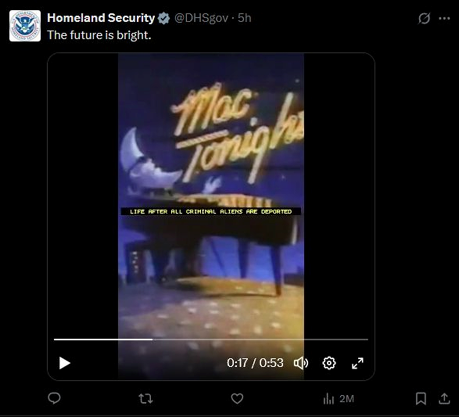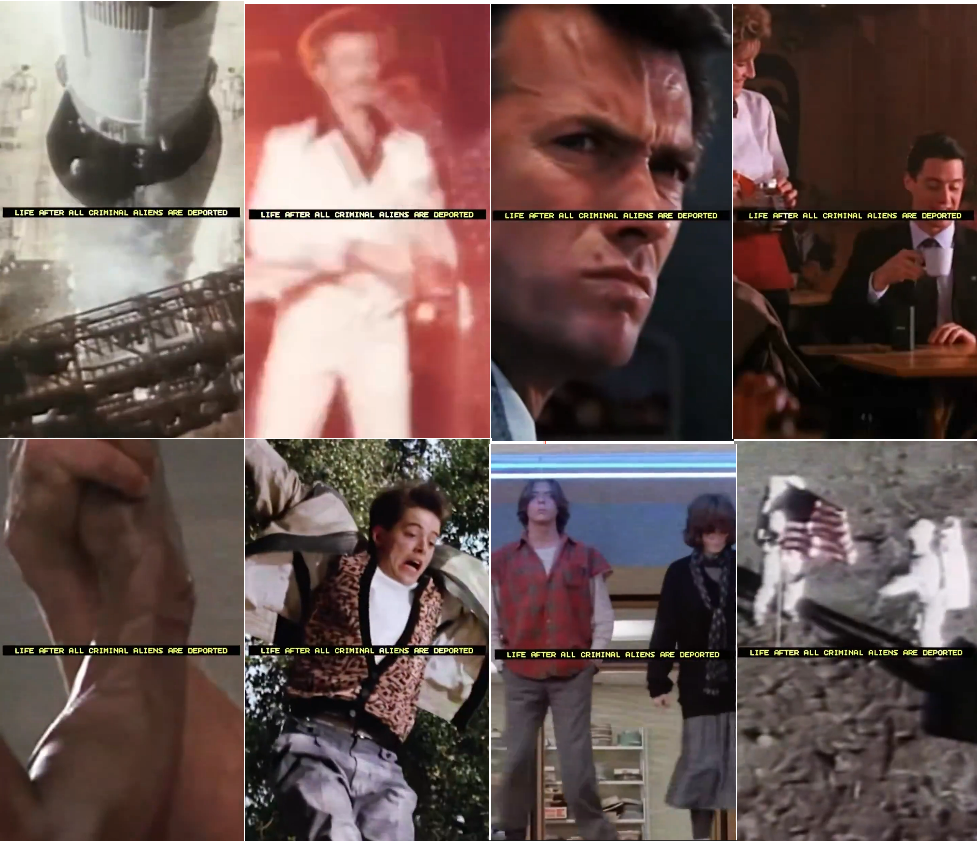 The US Department of Homeland Security, on Twitter, shared a vision of what America will look like once all the immigrants are gone, Hilariously, it has been taken down due to a copyright strike, but here are some frames from it. It's a series of old media clips with the text across the middle reading "life after all the criminal aliens are deported."