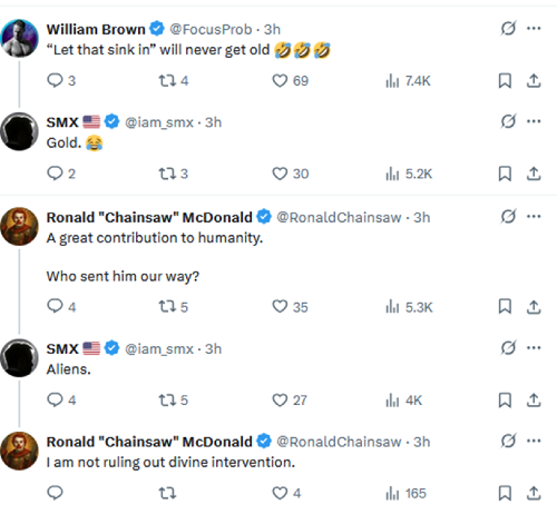 It has long been observed that Elon Musk was “redpilled” by Twitter. I don’t think he was ever left-of-center (if he was, the effect may have worked in the opposite direction), but the speed at which he rocketed (mind the pun) toward fascism in probably fewer than 10 years can only be explained by the feedback loop of sycophantic worship awarded to him by social media. Musk’s drug addictions are well documented but I don’t think any of them reach the height of the dopamine whack he gets from social media, an addiction so intense that he literally bought the factory to get high off his own supply. Every time he says anything on Twitter, Musk gets hundreds of thousands of replies that look like this: