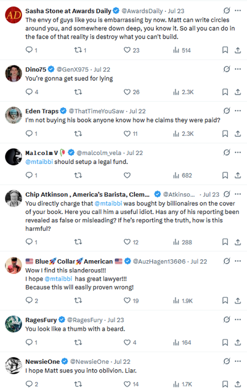 These concentrated personality cults can even be aimed and fired like a weapon, if you know how to wield it. Taibbi in particular only ever interacts with people on social media by so-called “quote-dunking”—rather than ever reply to criticism directly, reposting it so that he can invite his entire audience to respond, and if the mood lands just right, spark a harassment campaign against the critic to discourage them from speaking out again. To bring us full circle, here’s what Eoin Higgins’ Twitter replies have looked like for days after Taibbi threatened to sue him over a book that neither he, nor any of these people, have read: