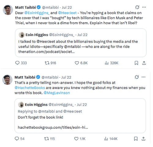 The book is Owned: How Tech Billionaires on the Right Bought the Loudest Voices on the Left, by Eoin Higgins. I was reminded I had it when Taibbi, one of the book’s main subjects, started going off on Twitter, making not-quite-veiled threats that he’s going to sue Higgins over its subtitle.