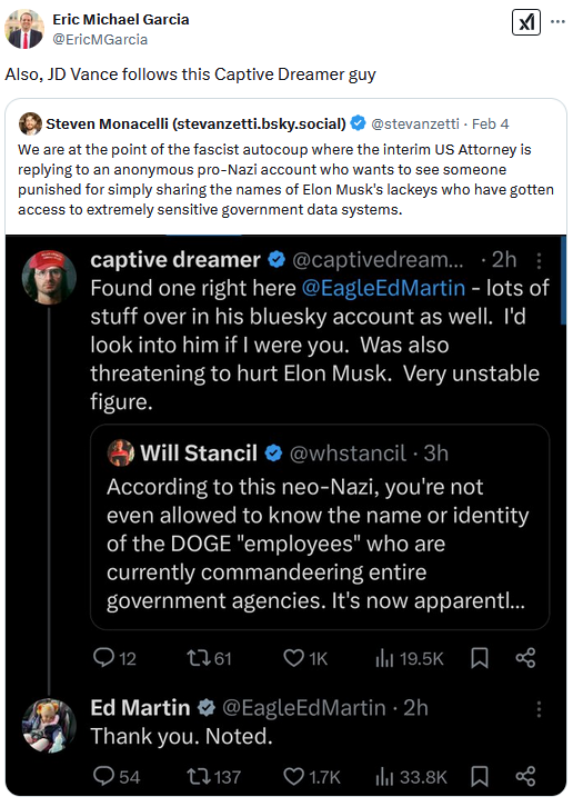 Vance, Elez, and the new US Attorney Ed Martin are all also linked somehow to a pseudonymous neo-Nazi on Twitter who goes by the name Captive Dreamer and from whom Vance may have gotten the tip for the whole Haitians eating cats lie that appeared in the run-up to the election.
