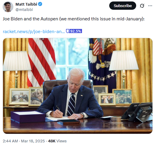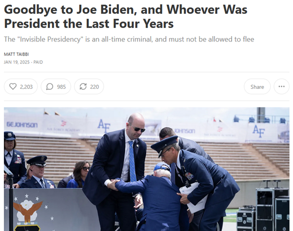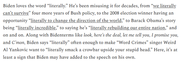 I don’t pay Matt so I can’t phase past his paywall and it’s entirely possible he does have overwhelming evidence that Biden was fully mentally incapacitated for four years and somehow nobody but Matt noticed until midway through the fourth. If so, I hope it’s more compelling than the evidence of senility he leads with, which is that Biden misuses the word “literally” an awful lot.