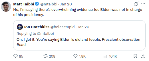 After Joe Biden’s humiliating first and final 2024 debate against Trump, when he repeatedly seemed to forget what words were (and when they came to him, he used the wrong ones) former credible journalist and Platonic form of smug Matt Taibbi was over the moon. Vindicated again! It proved, as he’d long suspected, that Biden is a vegetable, and he’s been rattling on about it ever since. He’s dead serious (excuse the pun) when he insists that Somebody Else was secretly doing all of that president shit the entire time his presidency served as the bitter filling in Taibbi’s delicious Trump sandwich.