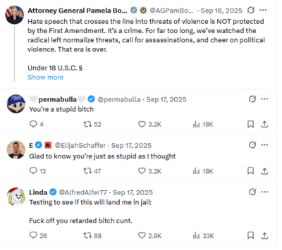 Who else is there? MAGA loyalists have for some time considered Pamela Bondi a weak link in the Trump Administration, and every time she says something that she thinks the base will enjoy (like making it illegal to insult Charlie Kirk) she is buried under waves of gendered insults and demands for an Attorney General with a Y chromosome.