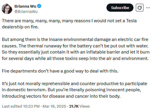 I don’t think it’s a good idea to set Teslas on fire, but only because an electric car fire is incredibly dangerous. Do I think a minority scared for their survival under a Musk/Trump dictatorship who sets fire to an empty Tesla should be brought up on domestic terrorism charges? Fuck no. A Tesla doesn’t need much help lighting on fire anyway, and the only person who has ever killed anyone with an exploding Tesla is, technically, Elon Musk