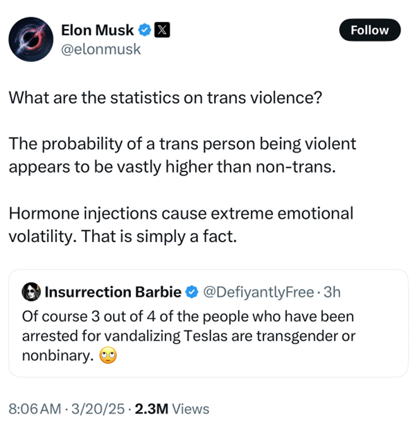 Allegedly, “3 out of 4 people who have been arrested for vandalizing Teslas are transgender or nonbinary.” That’s unconfirmed at the time of this writing but whether true or not Elon Musk has taken this revelation as proof that transgender people are overwhelmingly predisposed to violence.
