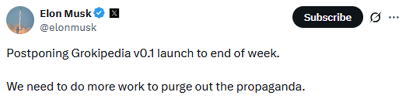 His coming alternative, “Grokipedia,” will be written by Grok, his large language model AI, which will reform the entire corpus of human knowledge from a neutral point of view, objective, and free of bias. It was supposed to launch Monday October 20, but…